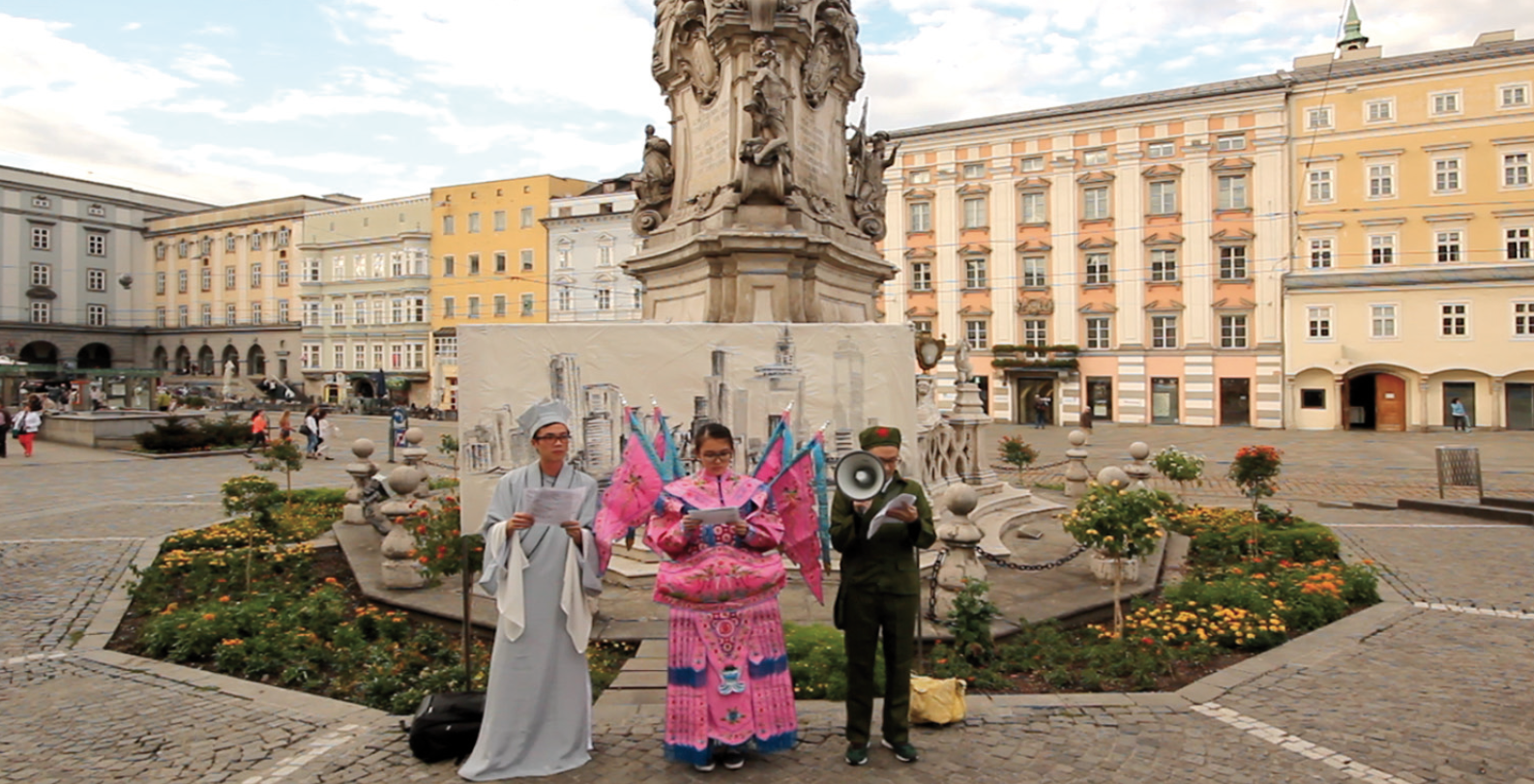 3 Chinesen Künstlerische Arbeit, Künstlerische Arbeit im öffentlichen Raum, Szenografie “3 Chinesen” –eine Urban Performance , 2014, am Hauptplatz in Linz (AT) Unterstützt durch Projektförderung der Kunstuniversität Linz Related