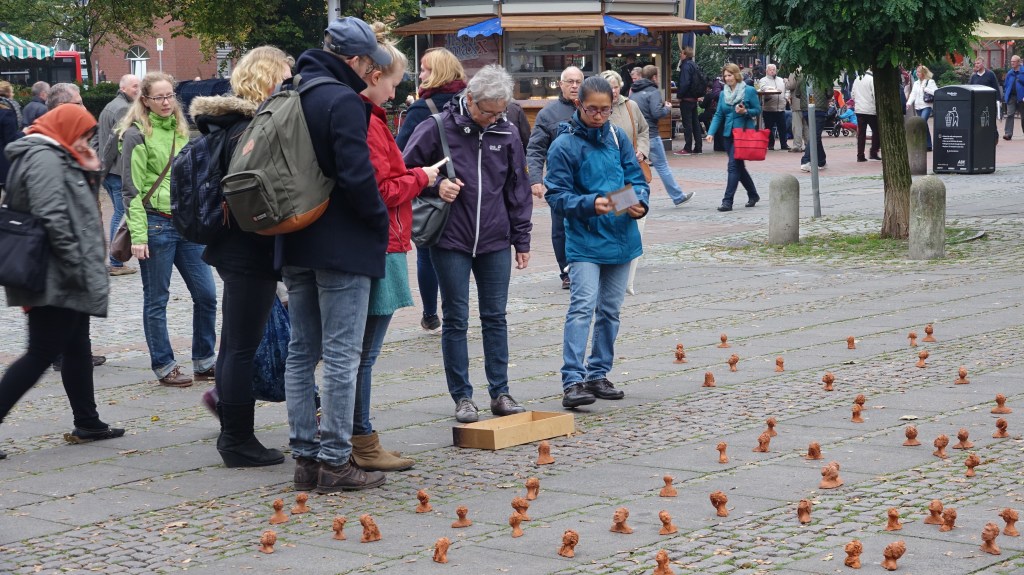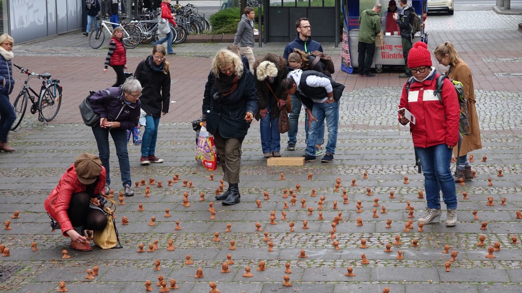 Halbes Jahr lang war ich mit einem Bauchladen und dem Tonmaterial in der Stadt Kiel unterwegs, suchte erste Kontakte mit insgesamt 500 Bürgern und Bürgerinnen im öffentlichen Raum. Darunter waren 250 Geflüchtete. Während dieser Begegnung wurden diese Menschen in circa 1Ocm großen Tonbürsten porträtiert. Am 8.10 wurden 500 Tonbürsten auf dem Europaplatz der Innenstadt Kiel installiert, so begannen die weiteren Begegnungen: Die Besucher_innen gingen durch die Portraits, suchten (sich oder andere) dabei und tauschten sich gegenseitig aus. Mit der Intention, durch diese intervenierende Aktion und Installation die Aufmerksamkeit des Themas in die Öffentlichkeit zu werfen und weitere Begegnungen der verschiedenen Menschen und Kulturen zu ermöglichen.