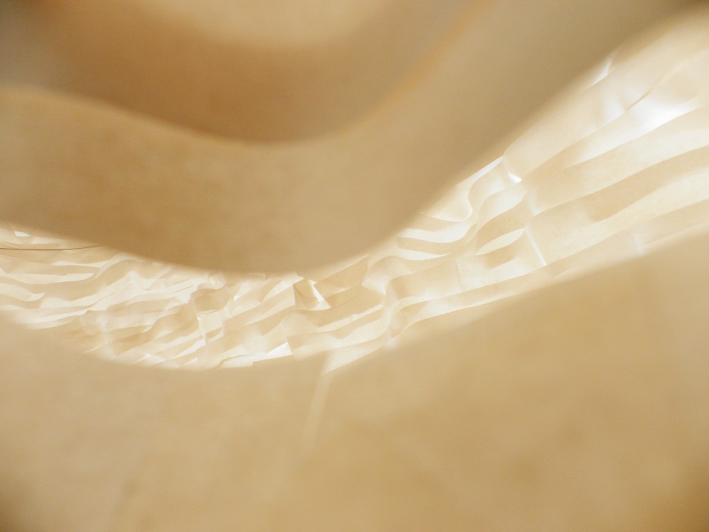 Das Medium Papier wird in einem einzelnen Streifen endlos wiederholt. Die Besuchenden schauen in einen endlosen Strudel und finden sich darin wieder. Sie stehen davor und ihr Auge folgt automatisch der Struktur einer spiralförmigen Bewegung. In diesem Moment kehren sie zurück zu dem Ursprung des Selbst.