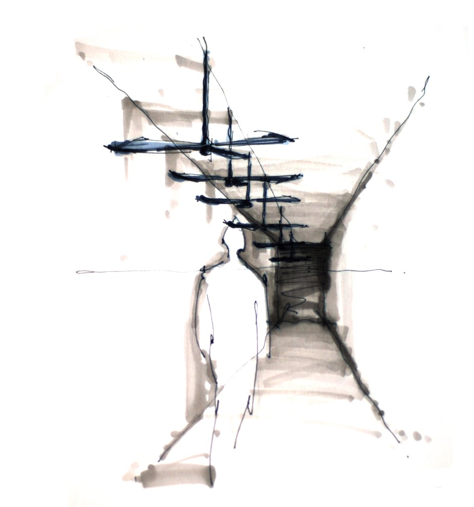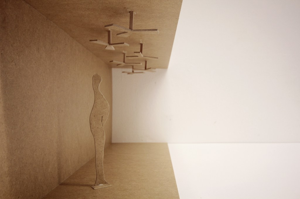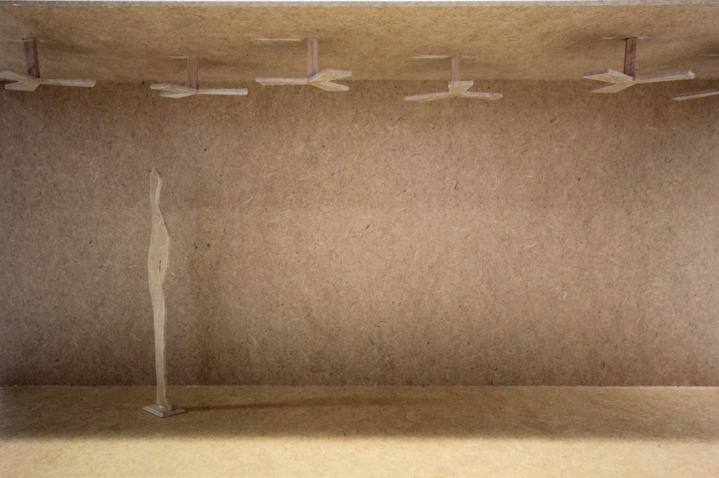 Sechs Ventilatoren unter der Decke erzeugen einen bedrohlichen Luftraum, was in Konkurrenz zur räumlichen Existenz der Vorbeigehenden steht. (unrealisiert )